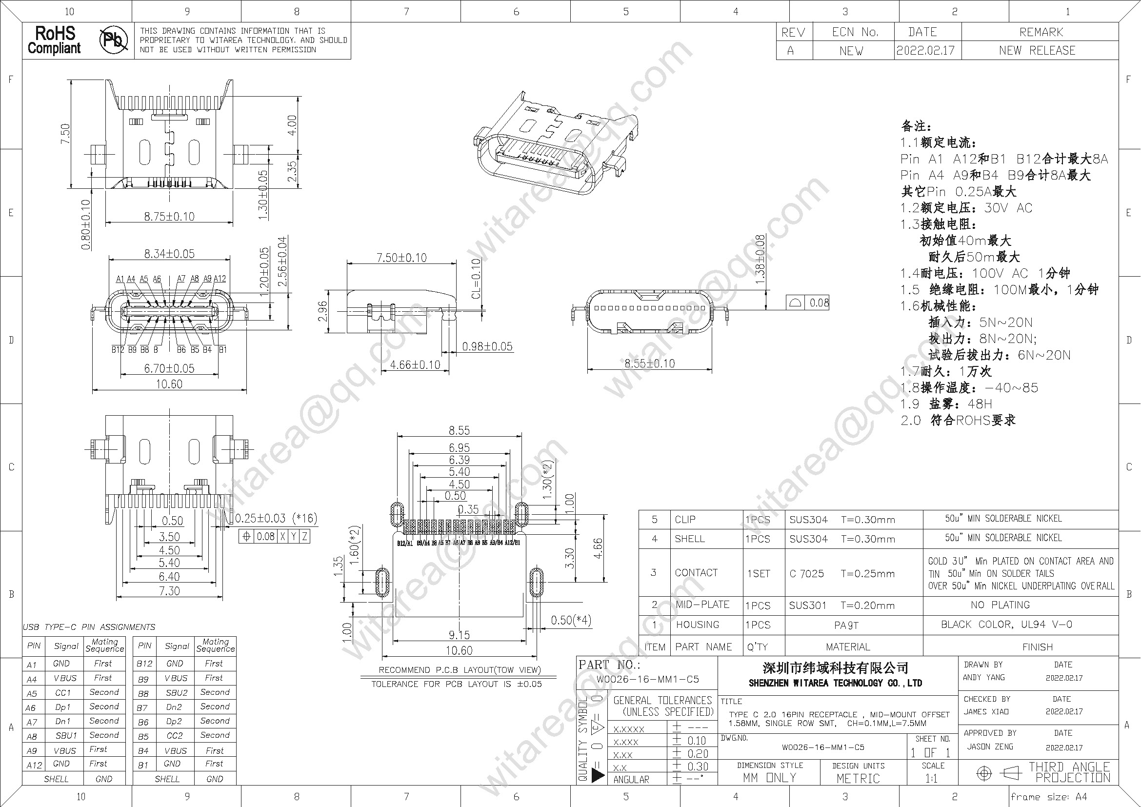 Usb2.0 type C 16p mid-mount offset 1.58mm SMT receptacle , CH=0.1mm, L=7.5mm , 48V 5A 240W |