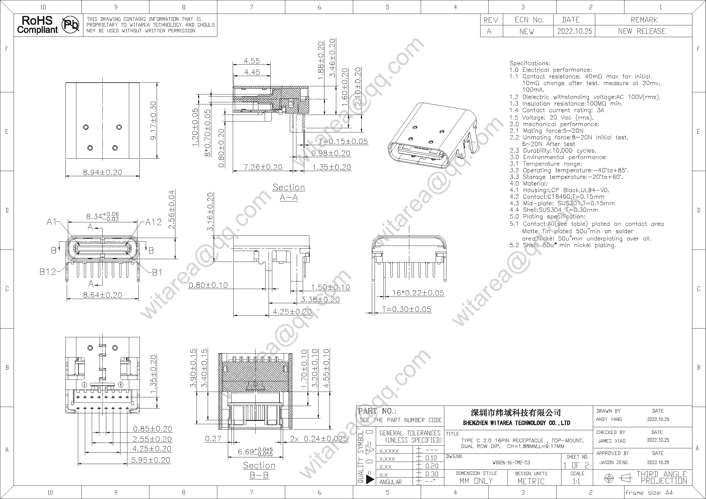 Usb2.0 type C 16p top-mount dual-row DIP receptacle, CH=1.88mm, L=9.17mm , 48V 5A 240W |