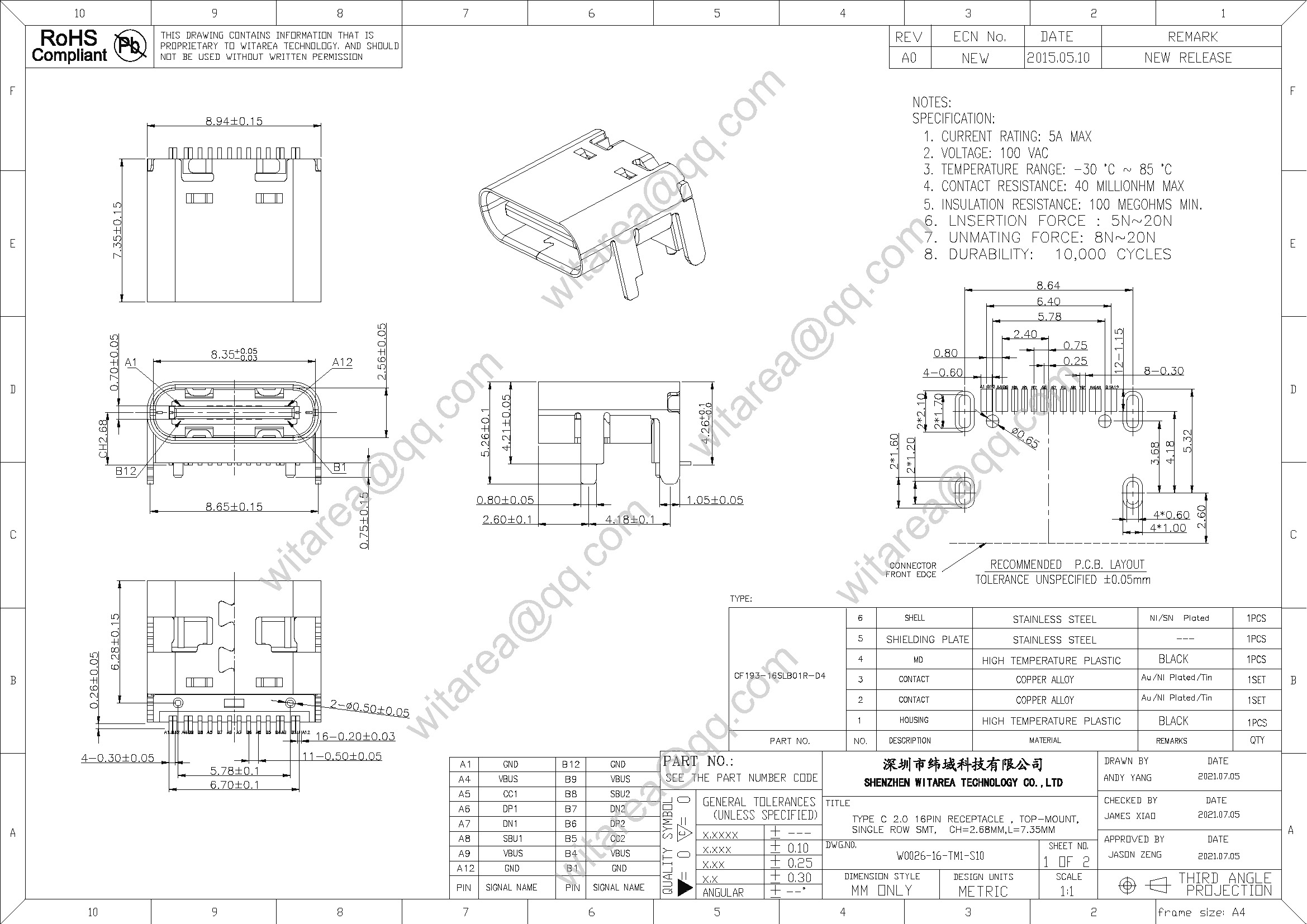 Usb2.0 type C 16p top-mount single-row SMT receptacle, CH=2.68mm, L=7.35mm , 48V 5A 240W |