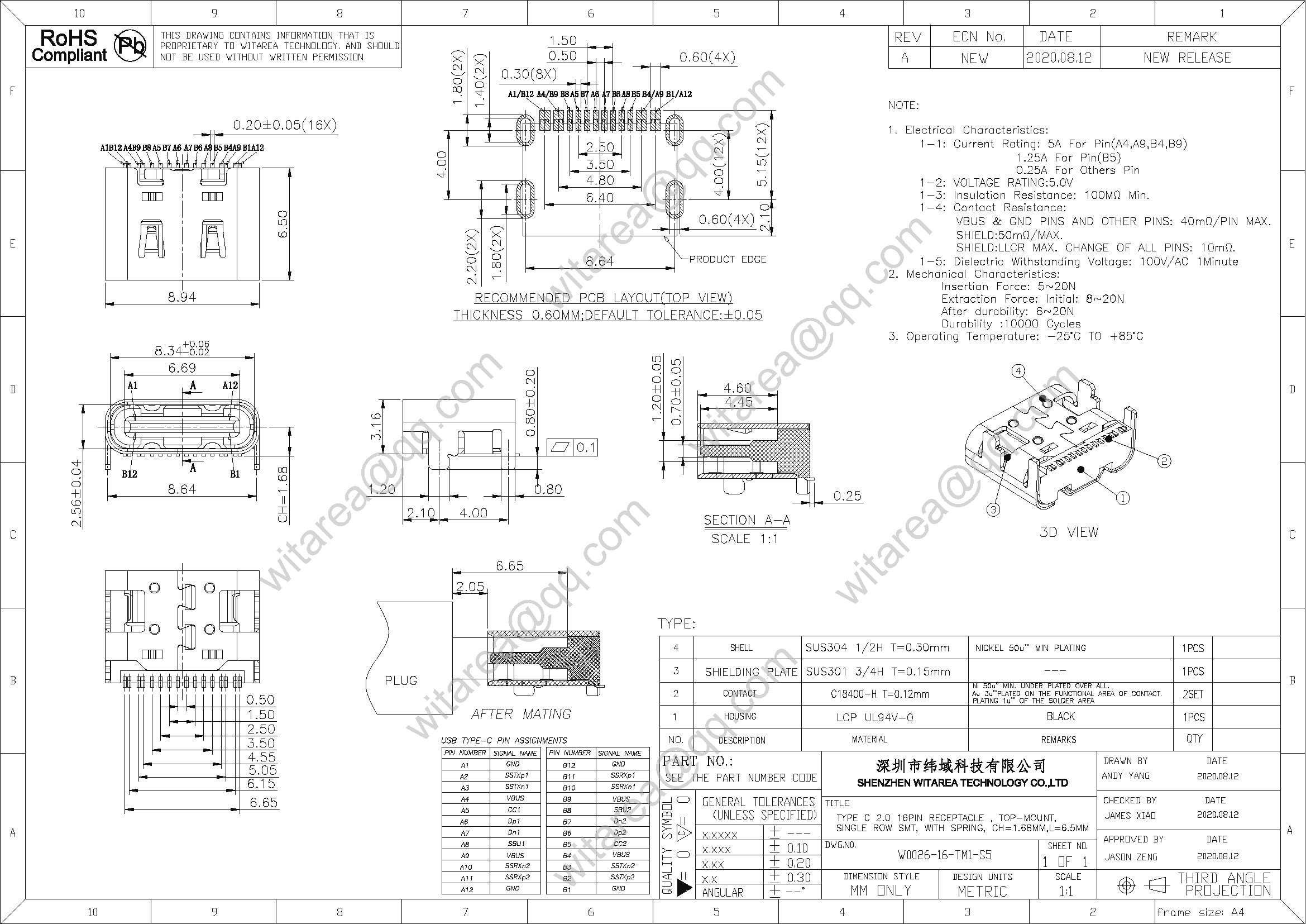 Usb2.0 type C 16p top-mount SMT receptacle with spring , CH=1.68mm, L=6.5mm , 48V 5A 240W |