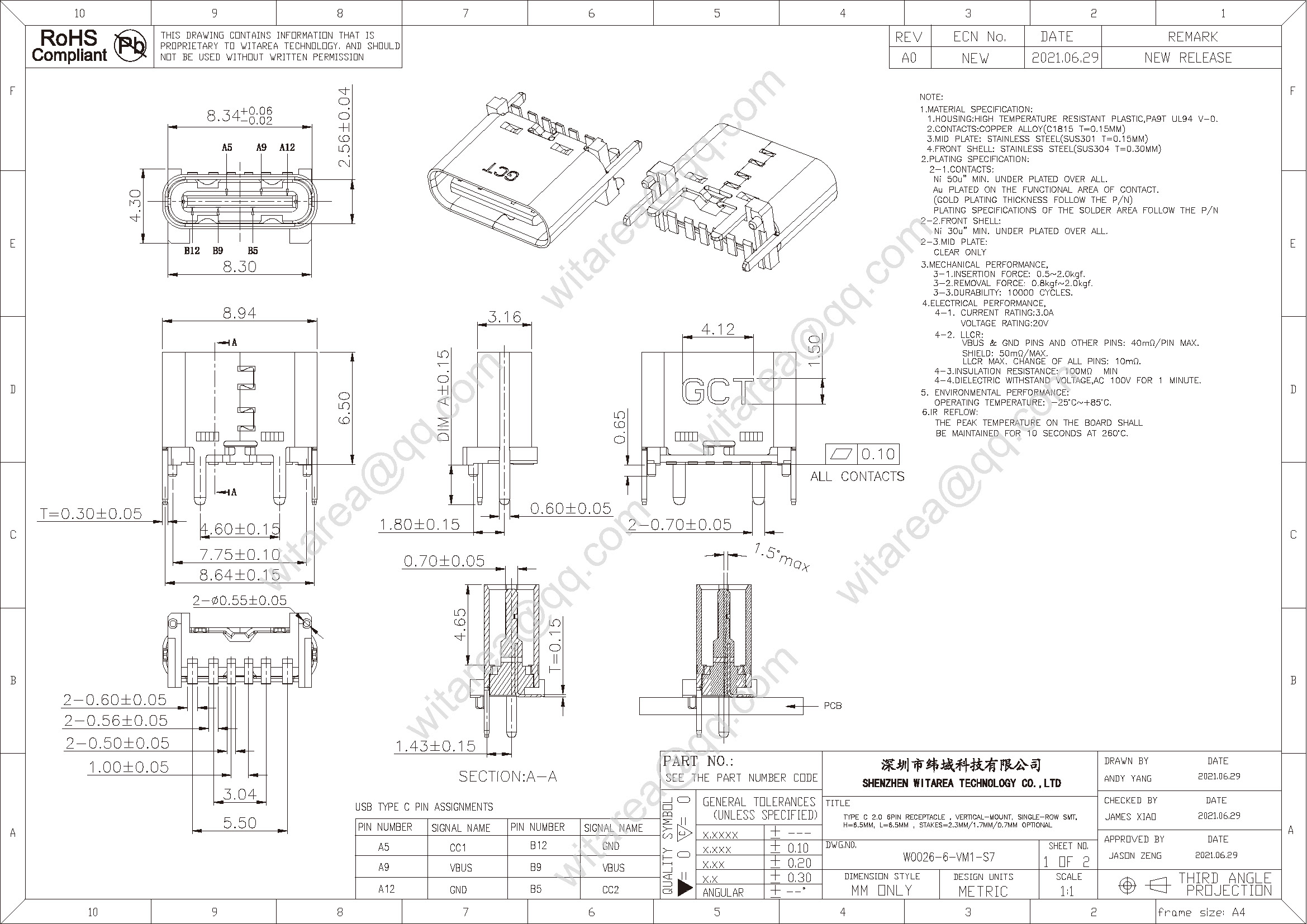 Usb2.0 type C 6p vertical-mount SMT receptacle , H=6.5mm, L=6.5mm, with stakes=2.3mm/1.7mm/0.7mm optional , 48V 5A 240W |