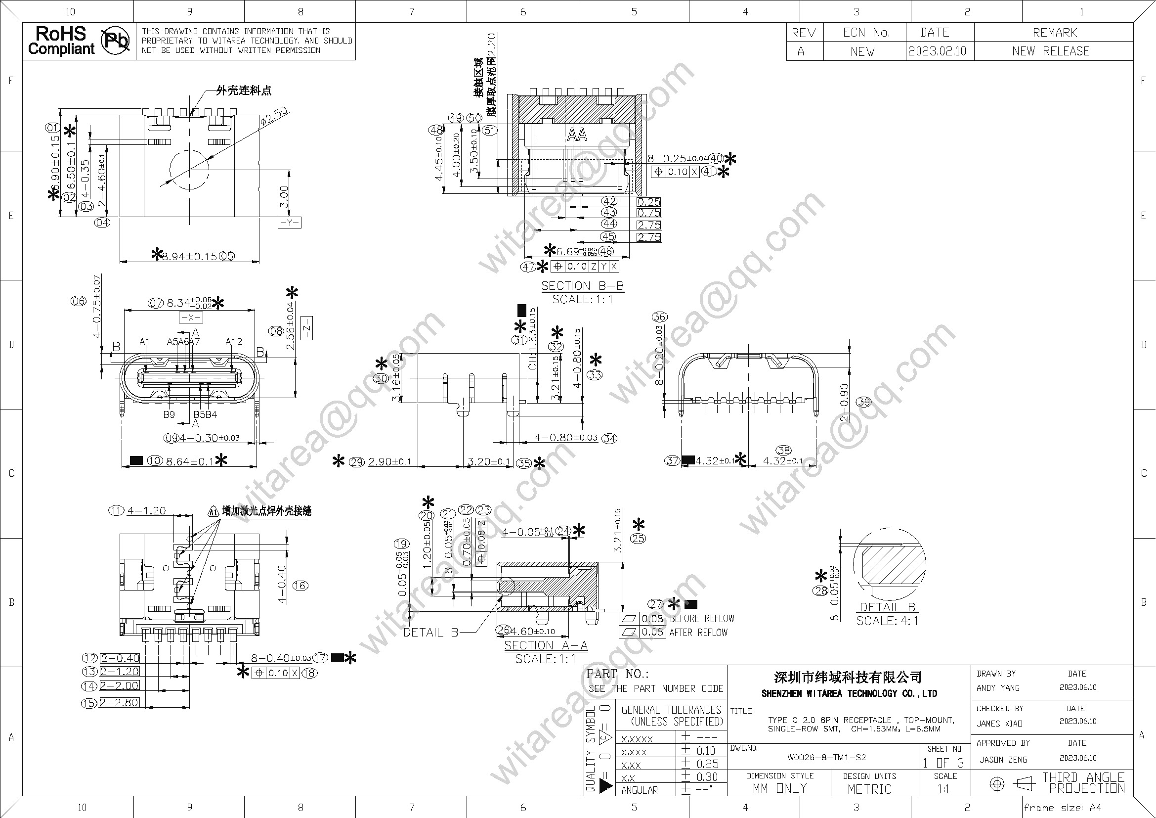 Usb2.0 type C 8p top-mount SMT receptacle with stakes=0.8mm , CH=1.63mm, L=6.5mm , 48V 5A 240W |