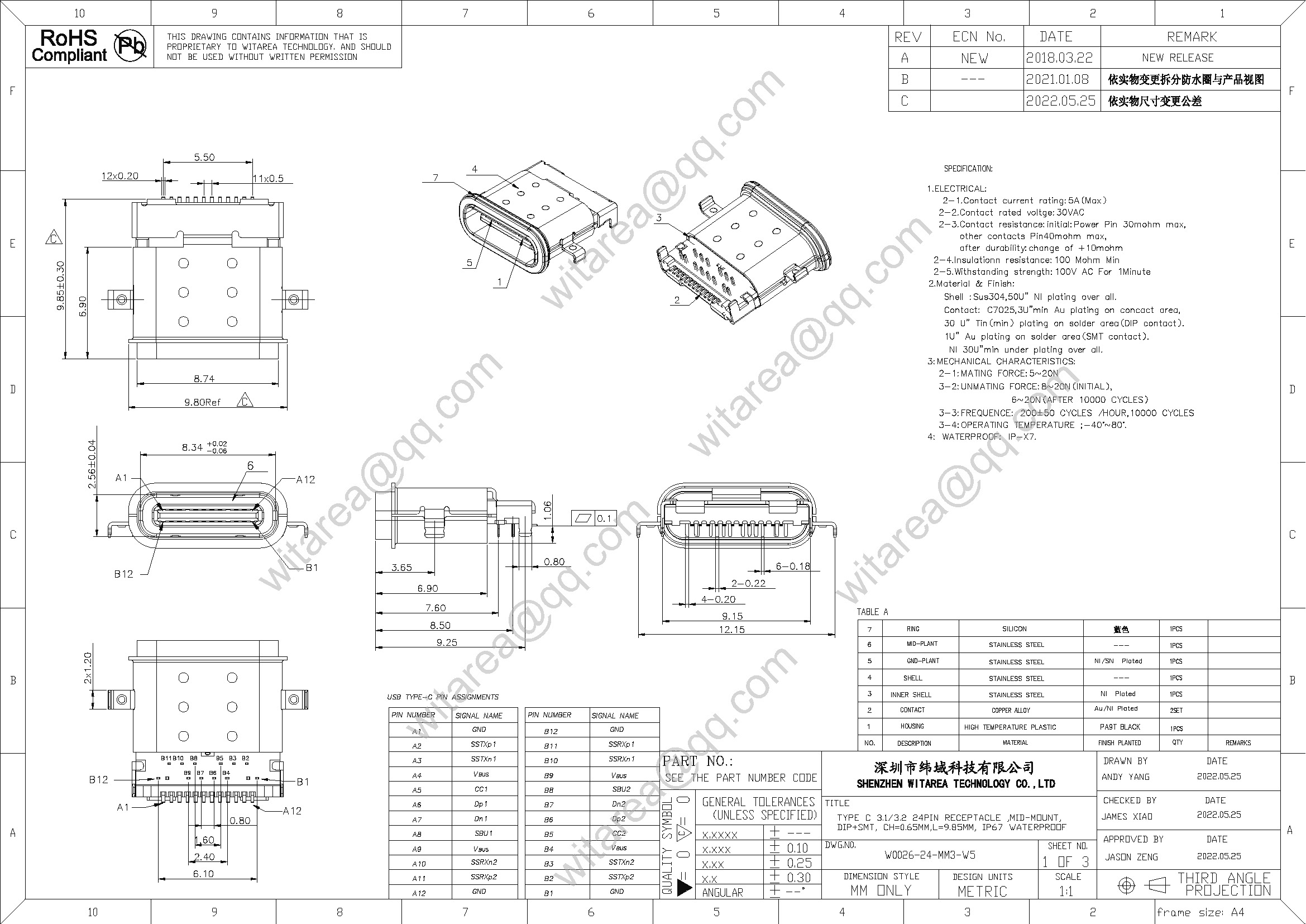 Usb 3.1 type C 24pin mid-mount DIP+SMT receptacle, CH=0.65mm,L=9.85mm, IP67 waterproof 48V 5A 240W |
