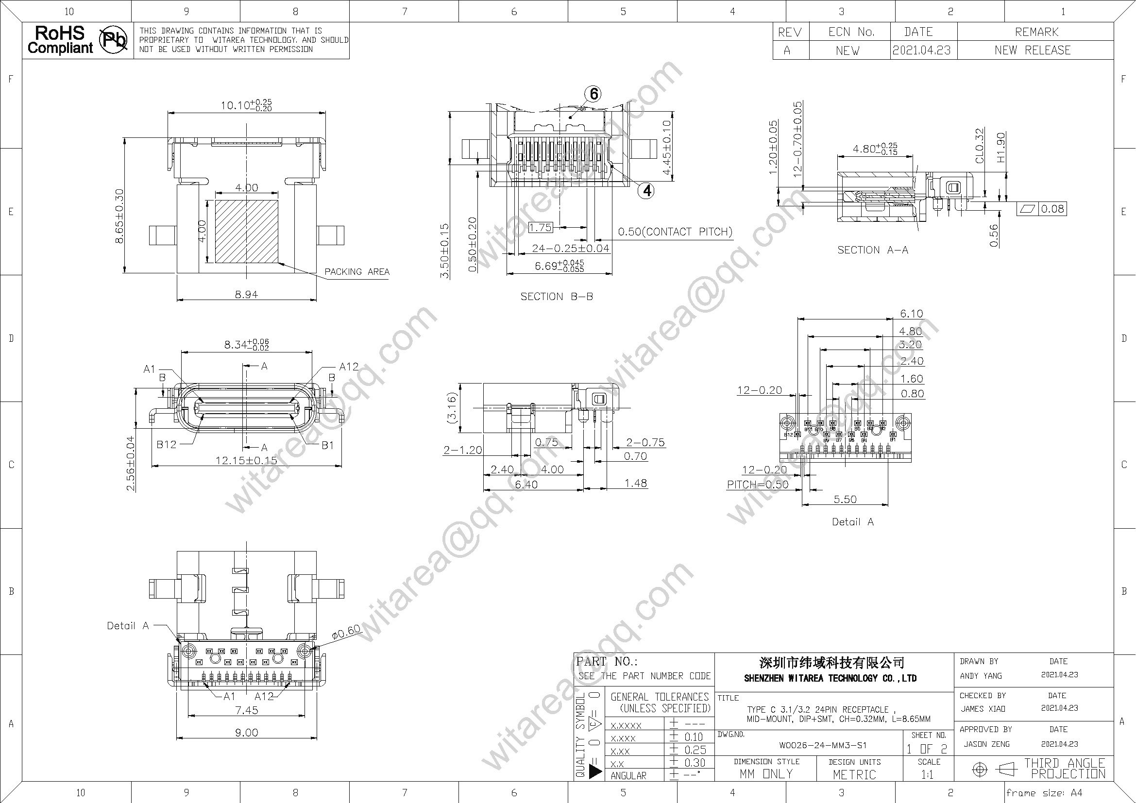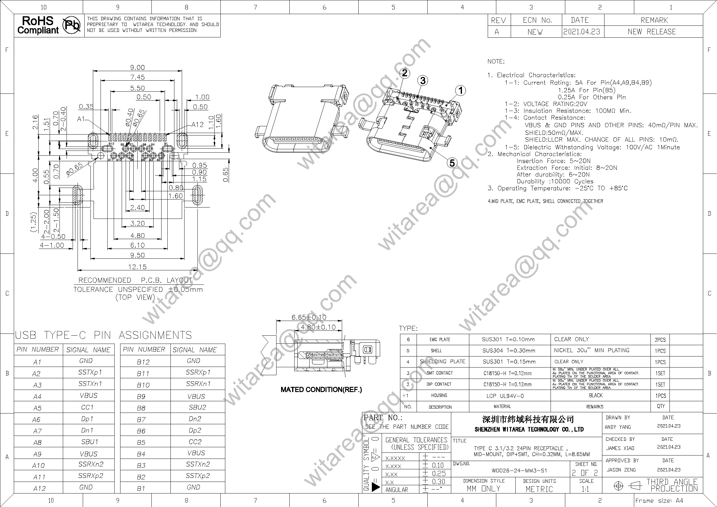 Usb 3.0/3.1 type C 24pin mid-mount DIP+SMT receptacle, CH=0.32mm,L=8.65mm,48V 5A 240W |