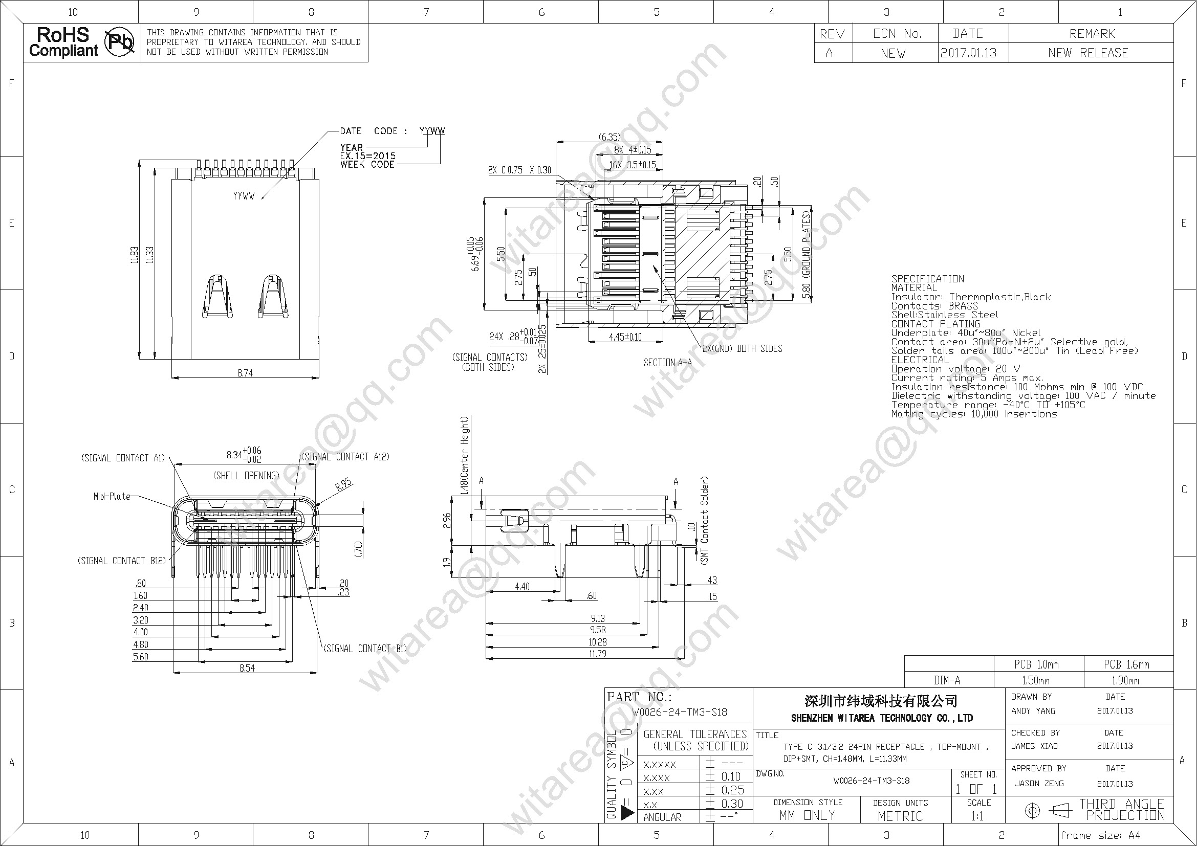 Usb 3.0/3.1 type C 24pin top-mount DIP+SMT receptacle, CH=1.48mm,L=11.33mm, 48V 5A 240W |