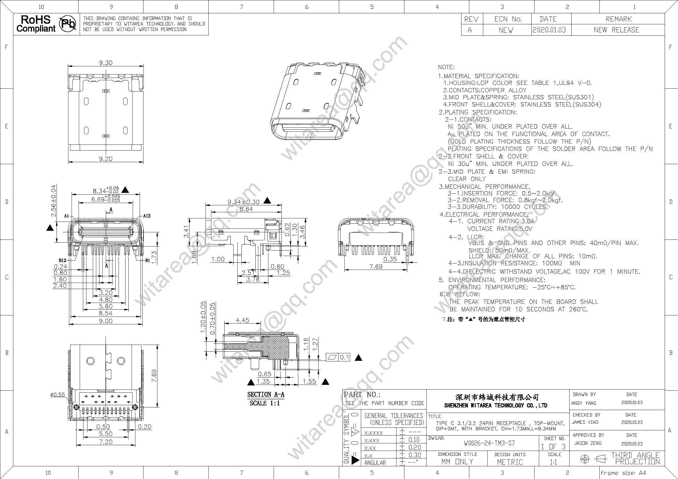 USB3.0/3.1 TYPE C 24PIN RECEPTACLE,Top mount, DIP+SMT Hybrid, CH=1.73mm,L=9.34mm,With bracket,48v 5A 240W |