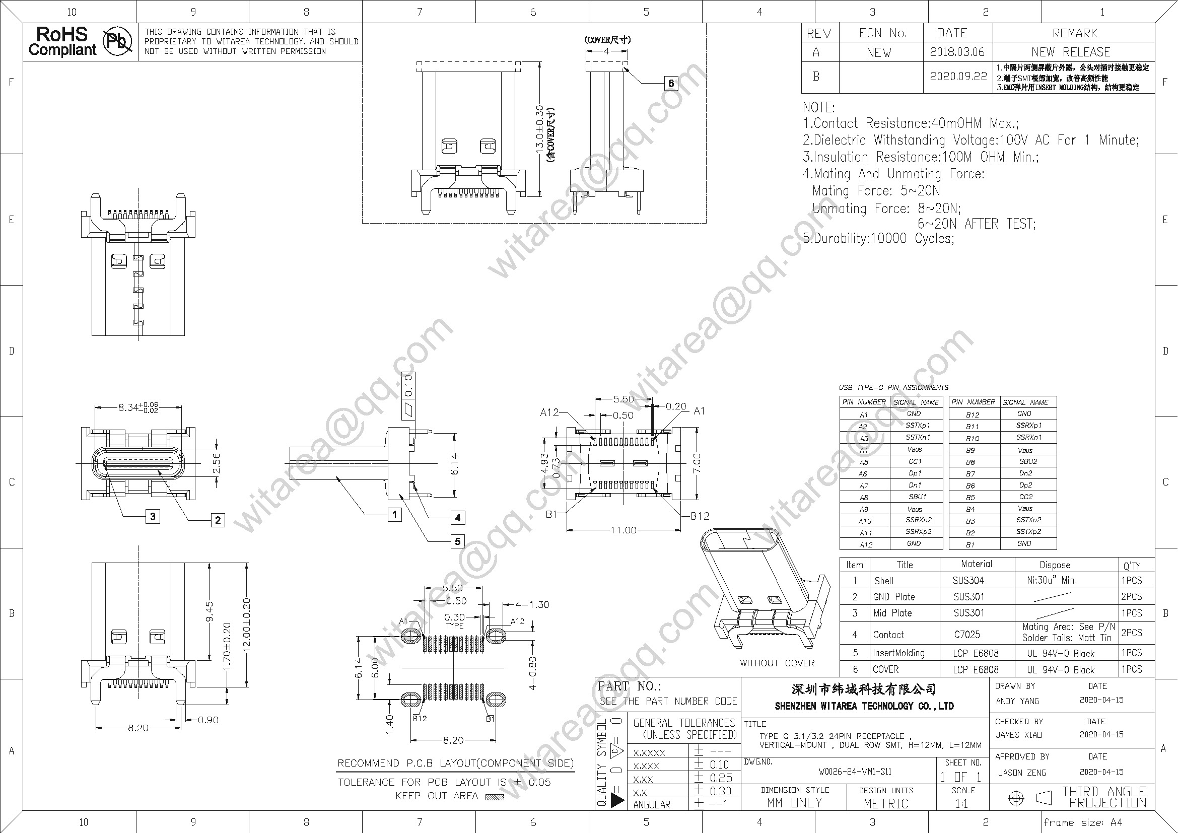 Usb 3.0/3.1 type C 24pin vertical-mount dual-row SMT receptacle, H=12mm,L=12mm, 48V 5A 240W |