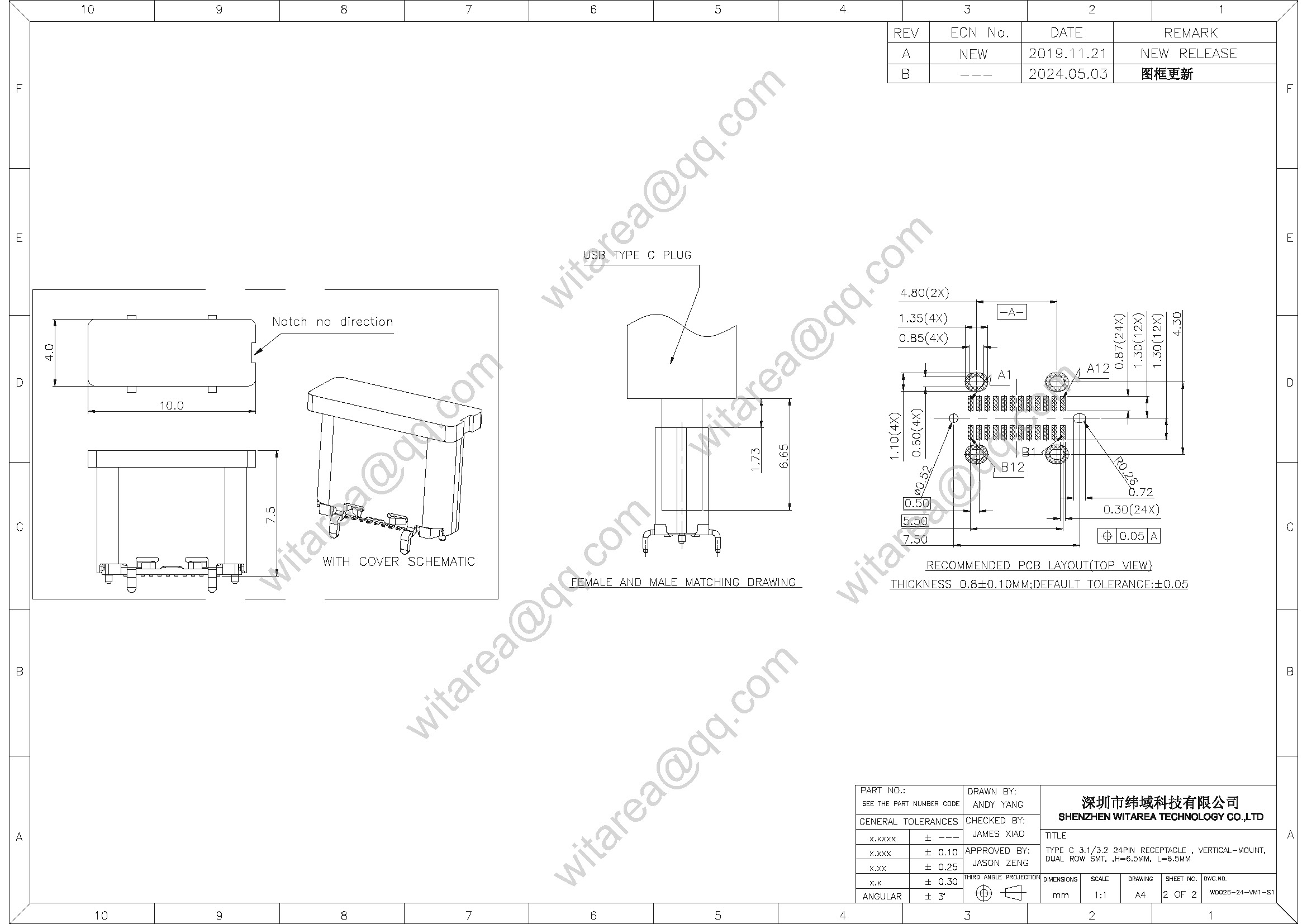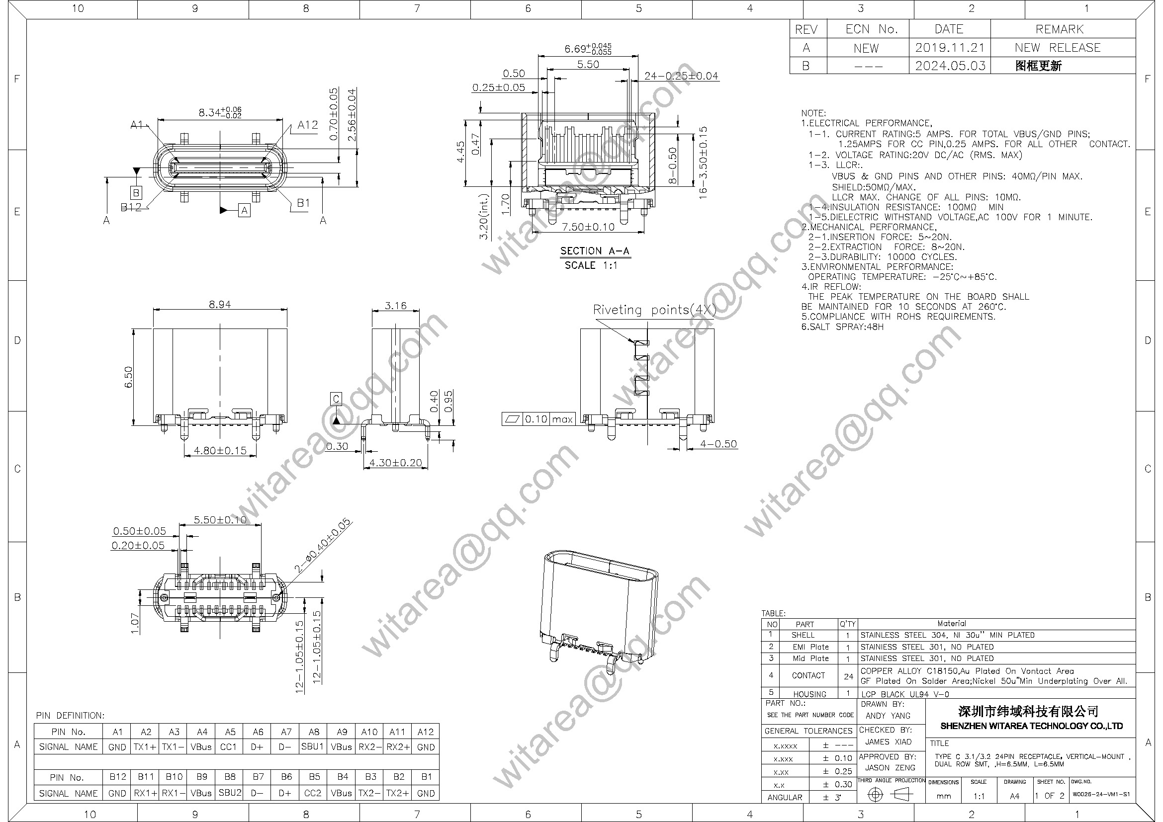 Usb 3.0/3.1 type C 24pin vertical-mount dual-row SMT receptacle, H=6.5mm,L=6.5mm, 48V 5A 240W |
