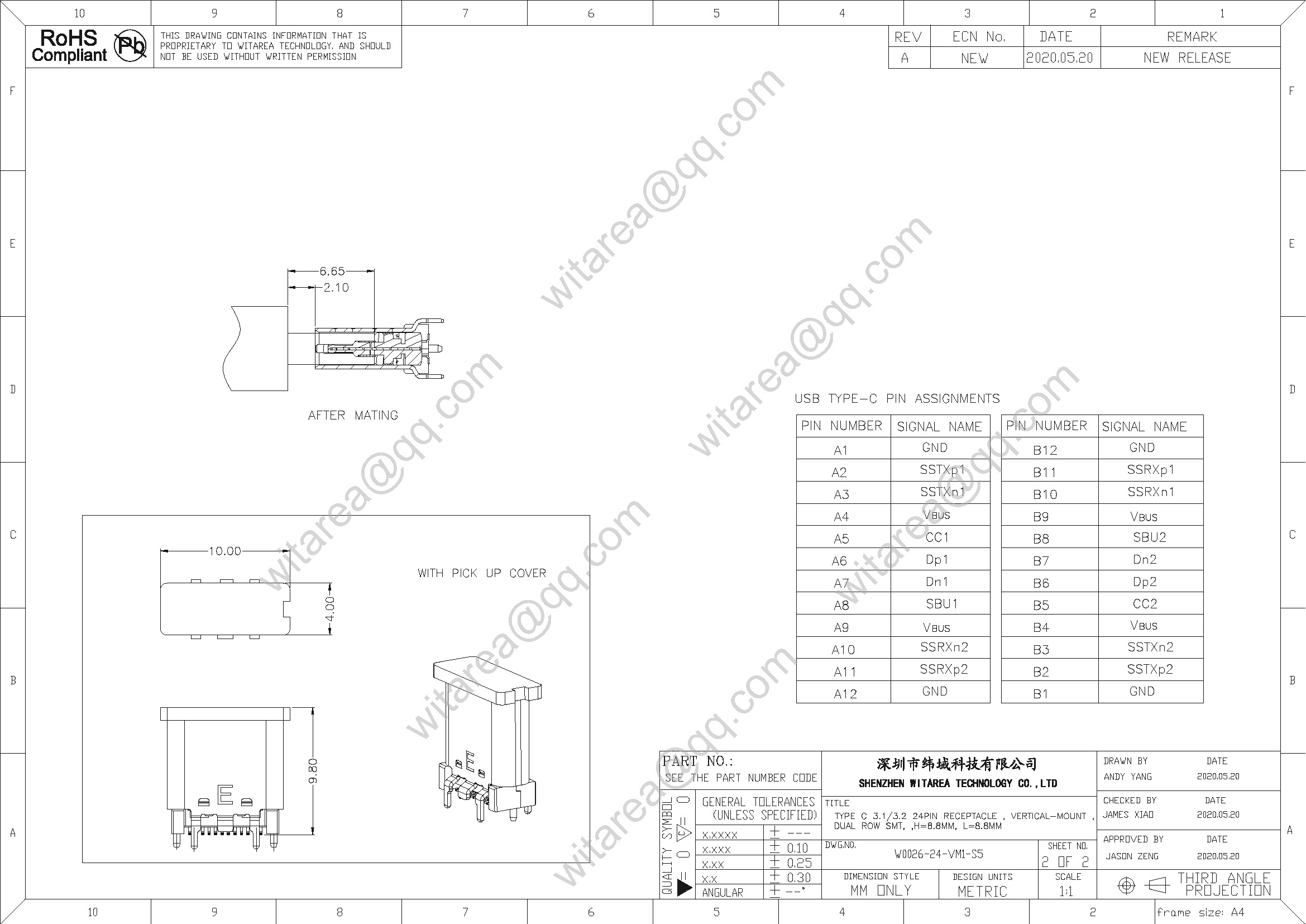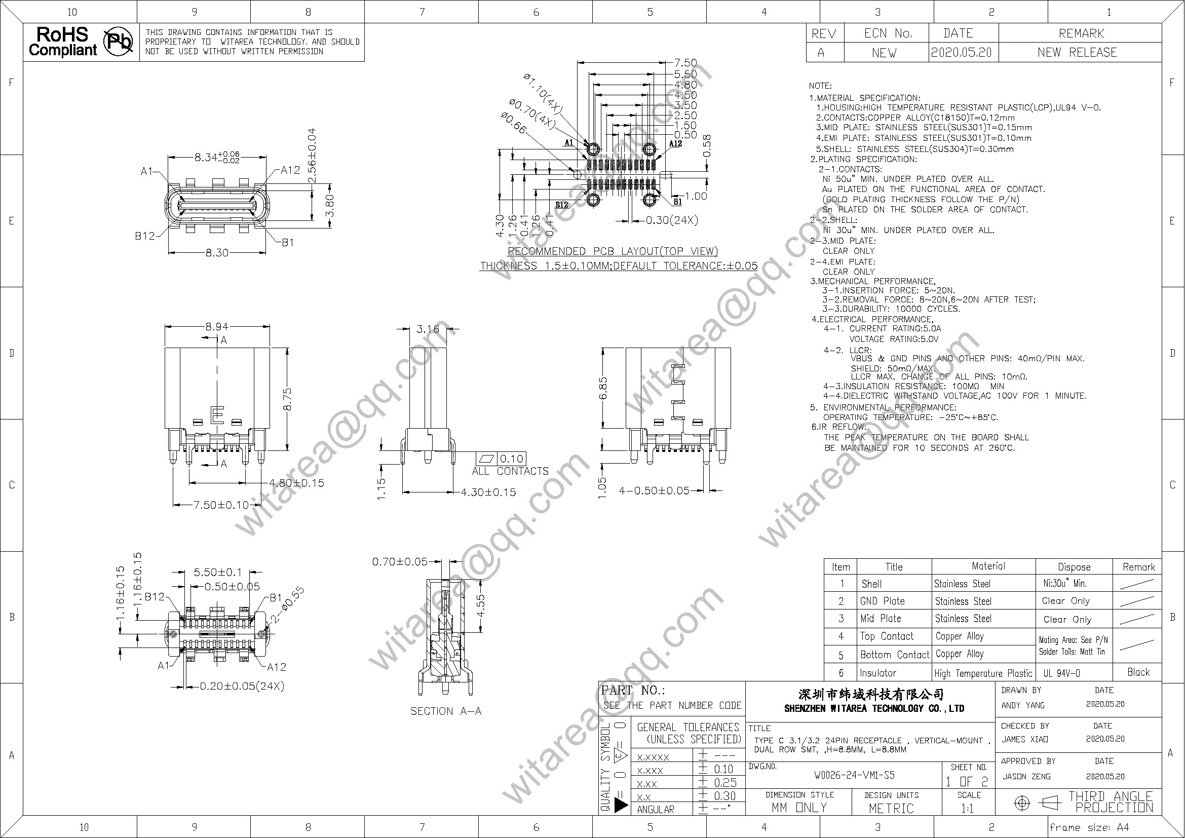 Usb 3.0/3.1 type C 24pin vertical-mount dual-row SMT receptacle, H=8.8mm,L=8.8mm, 48V 5A 240W |