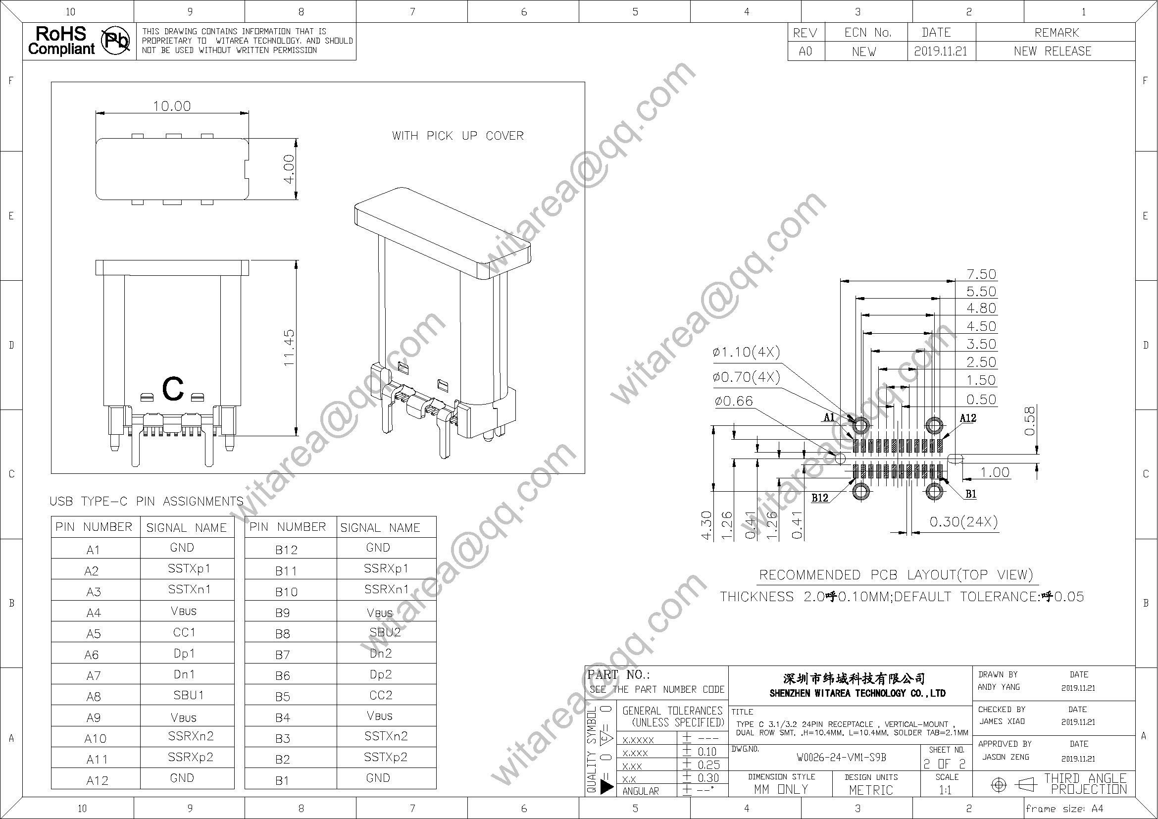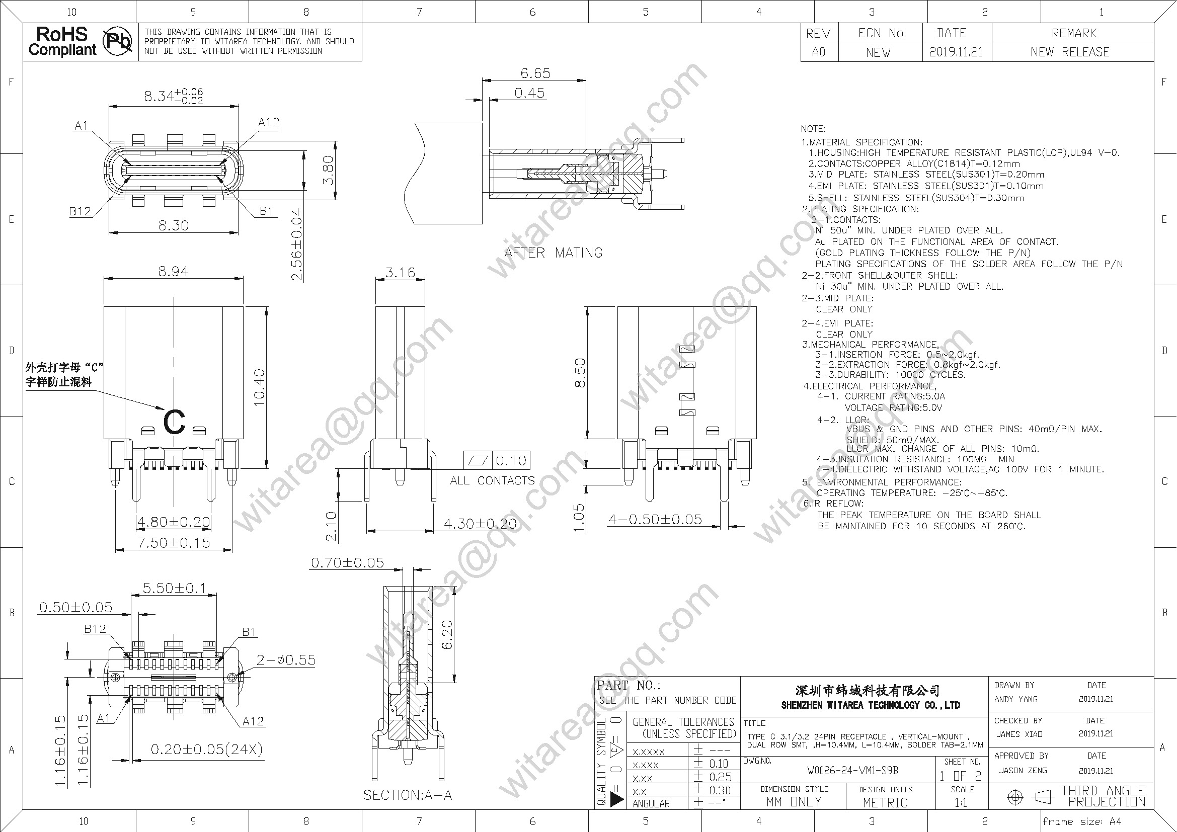 Usb 3.0/3.1 type C 24pin vertical-mount dual-row SMT receptacle with stakes=2.1mm, H=10.4mm,L=10.4mm, 48V 5A 240W |