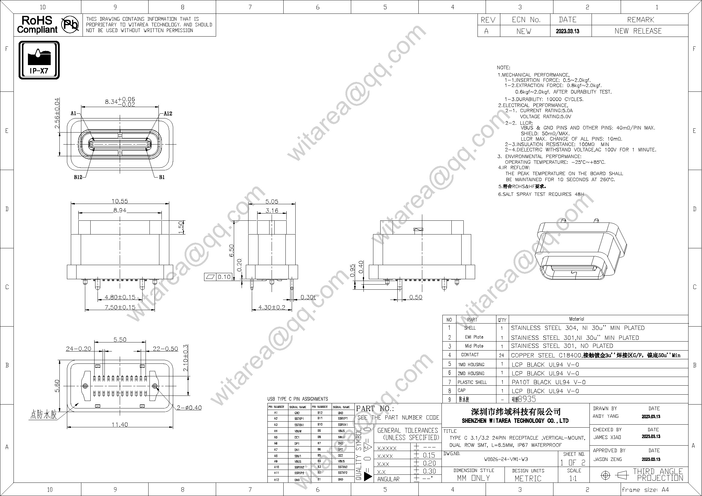Usb 3.1 type C 24pin vertical-mount dual-row SMT receptacle, L=6.5mm, IP67 waterproof 48V 5A 240W |