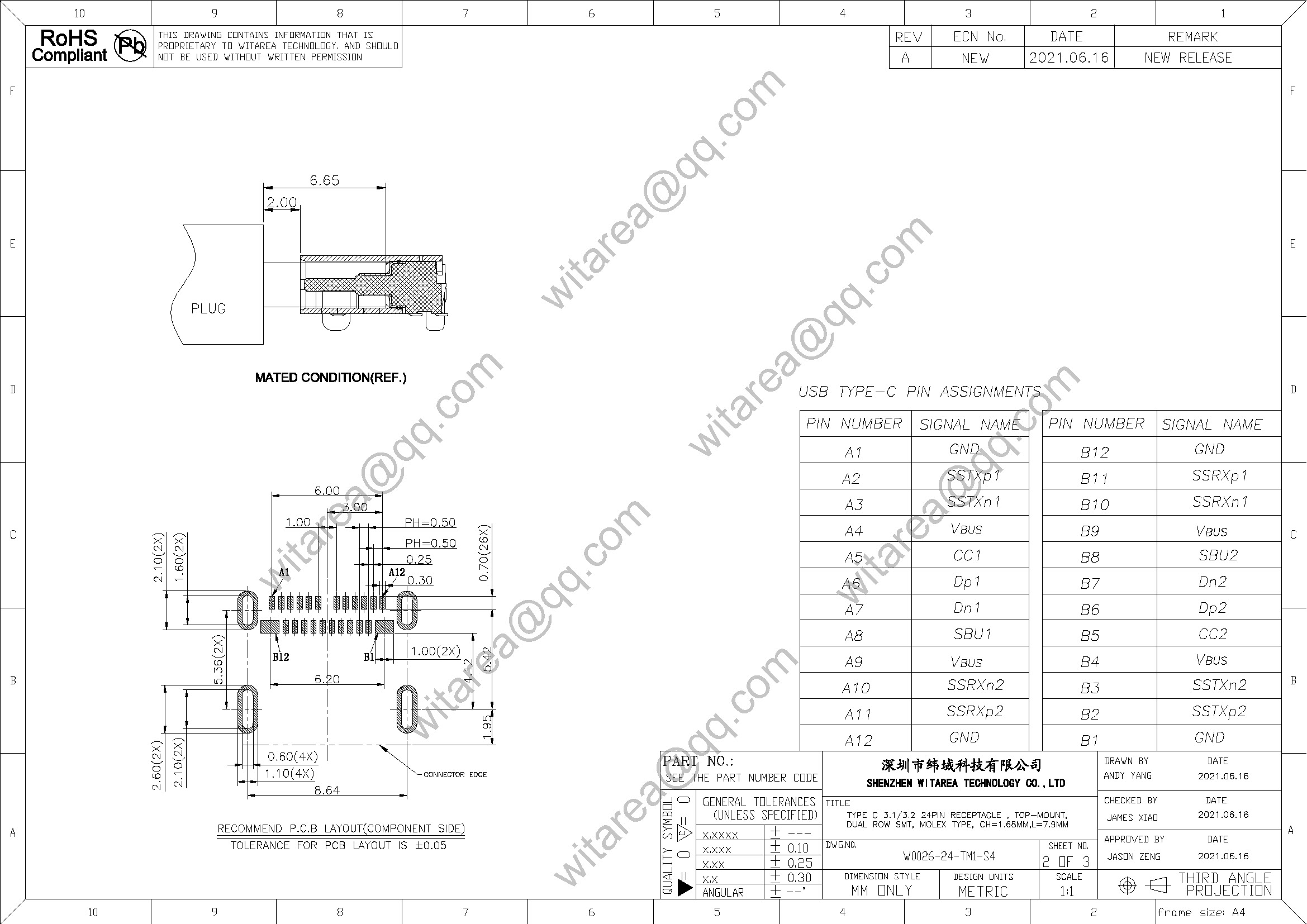 USB3.1 TYPE C 24P top-mount dual-row SMT receptacle, molex type,CH=1.68mm,L=7.9mm, 48V 5A 240W |