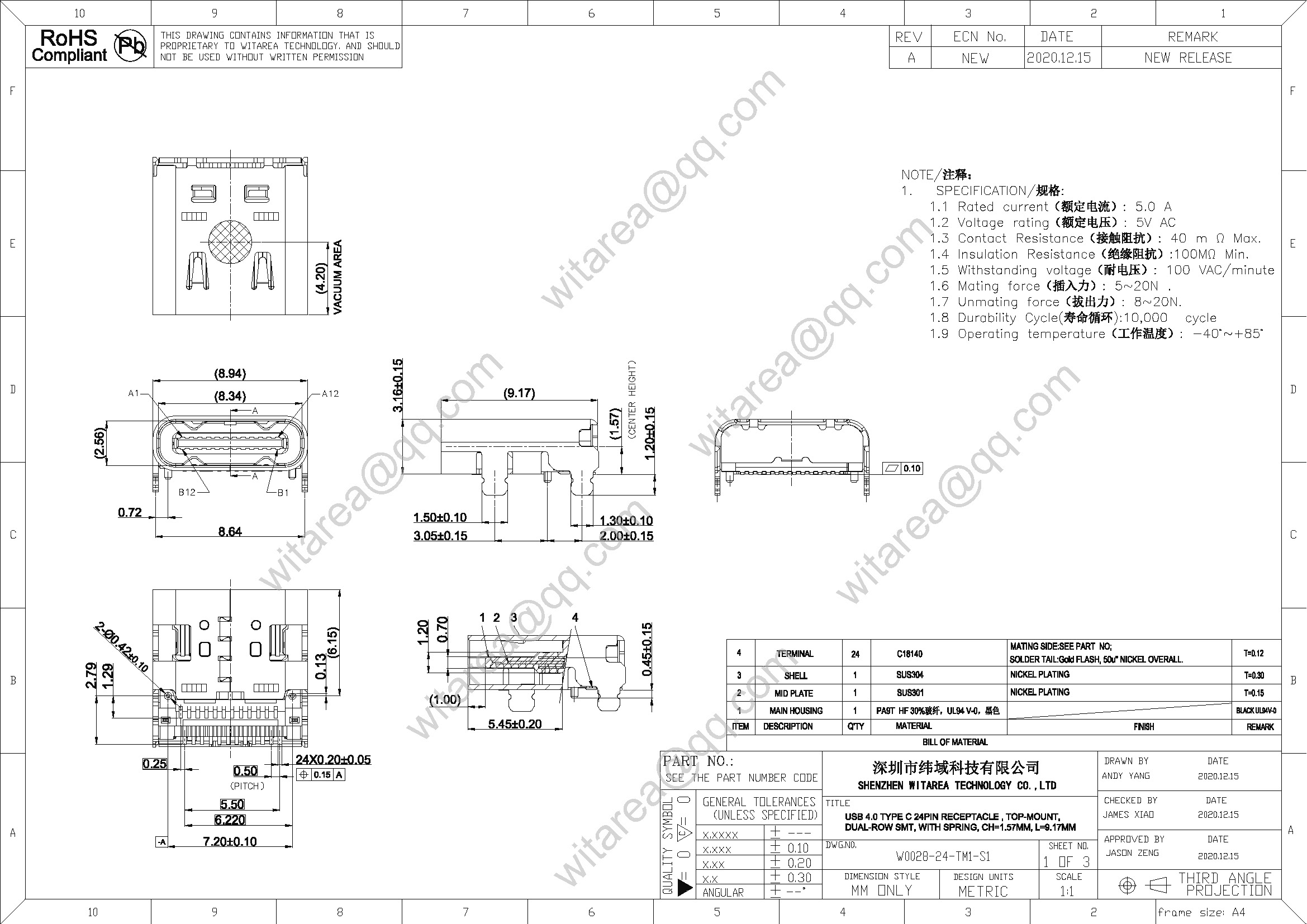 | Products: | USB 4.0 TYPE C 24PIN RECEPTACLE , TOP-MOUNT, DUAL-ROW SMT, WITH SPRING, CH=1.57MM, L=9.17MM |
