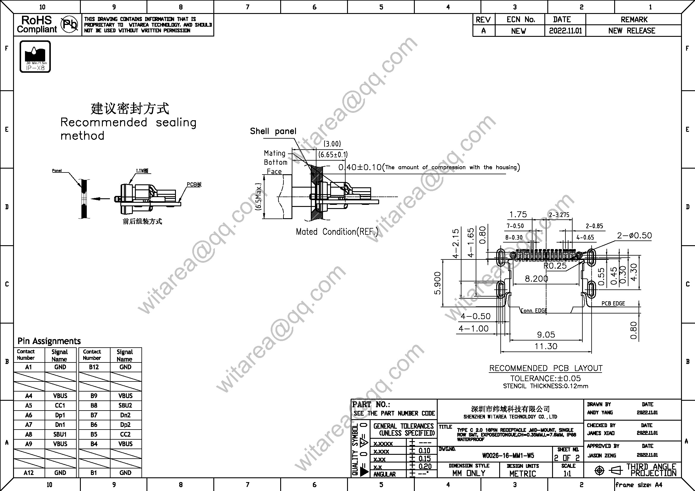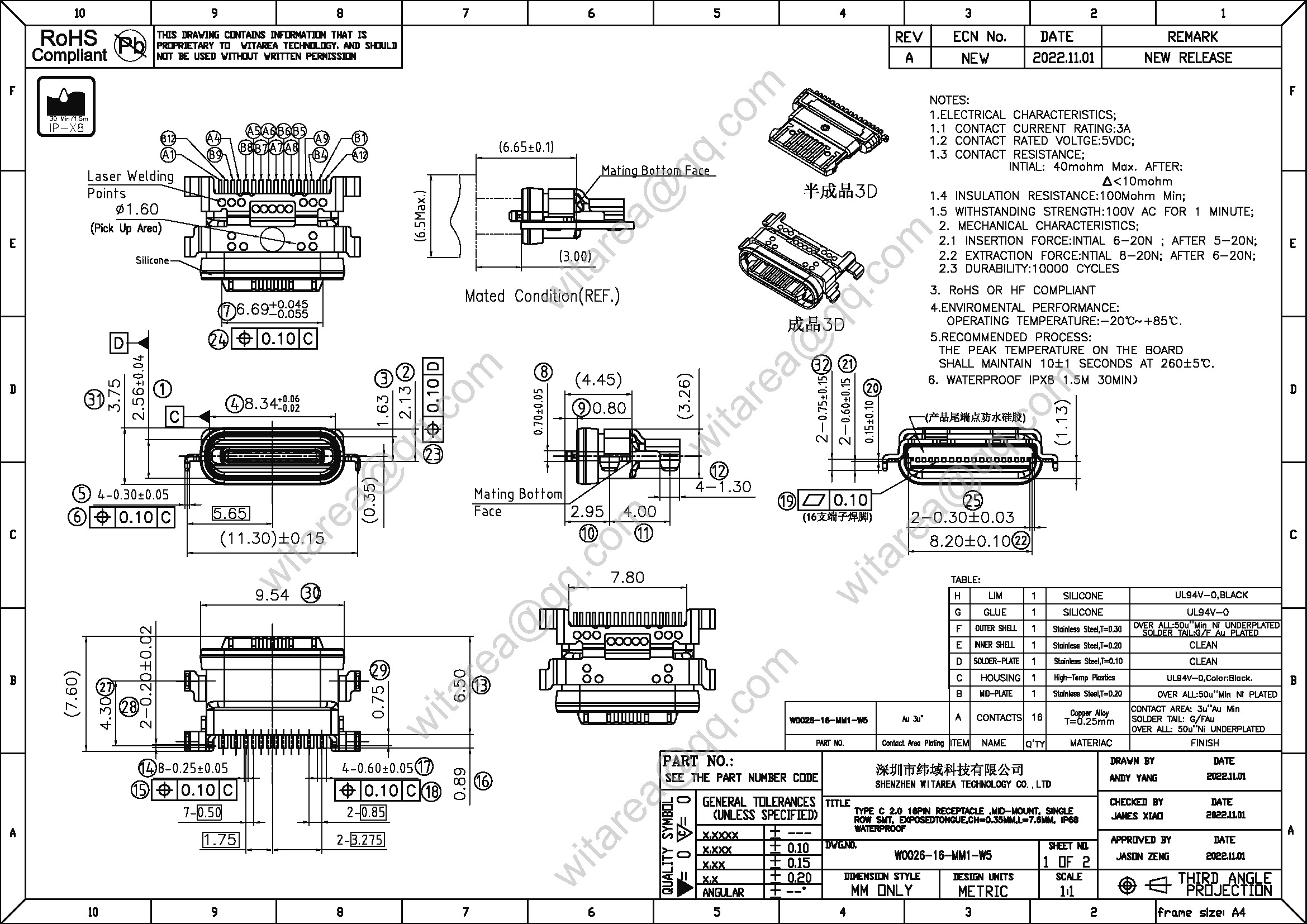 TYPE C 2.0 16PIN RECEPTACLE ,MID-MOUNT, SINGLE ROW SMT, EXPOSED TONGUE,CH=0.35MM,L=7.6MM, IP68 WATERPROOF |