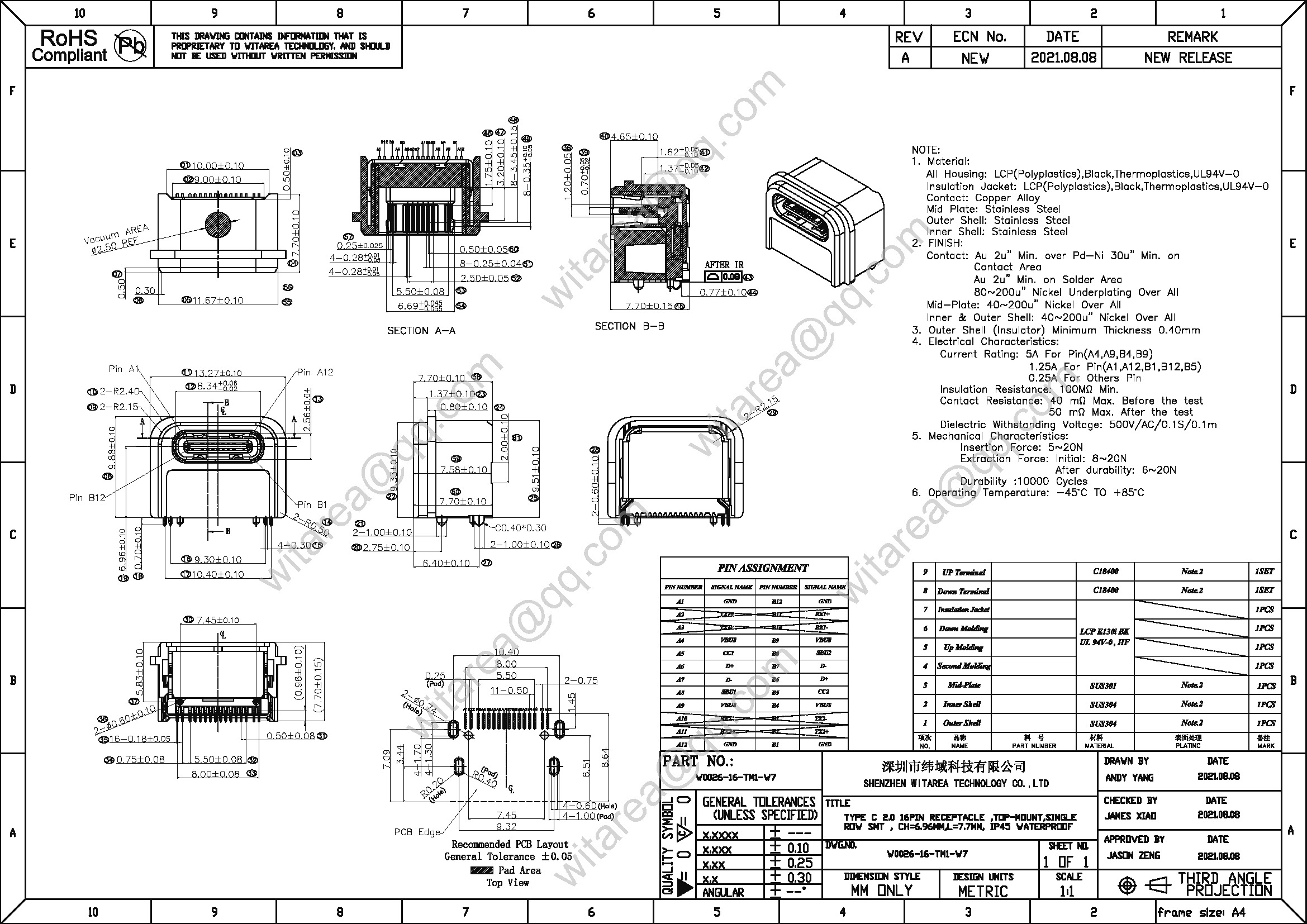 TYPE C 2.0 16PIN RECEPTACLE ,TOP-MOUNT,SINGLE ROW SMT , CH=6.96MM,L=7.7MM, IP45 WATERPROOF |