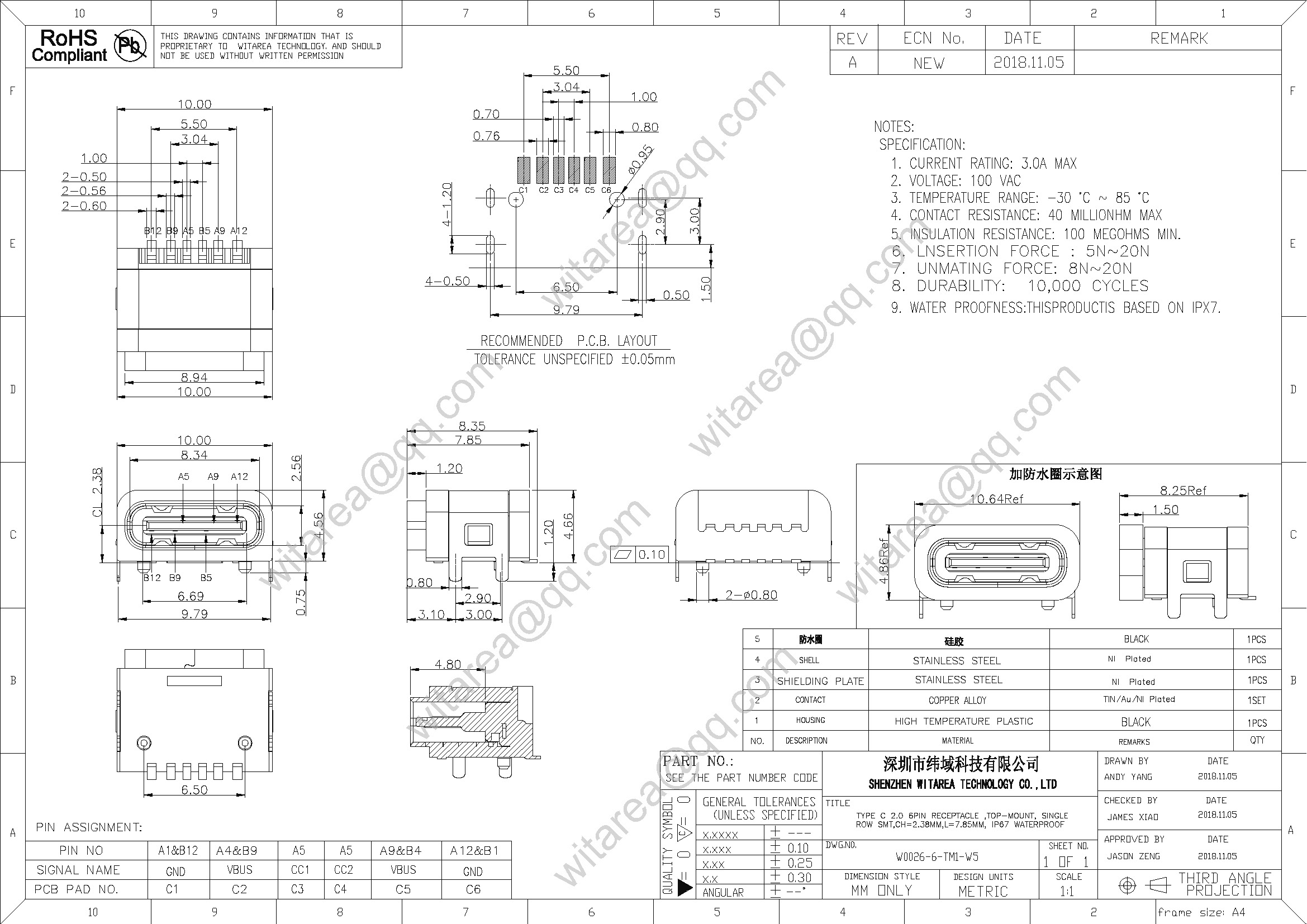 | Products: | TYPE C 2.0 6PIN RECEPTACLE ,TOP-MOUNT, SINGLE ROW SMT,CH=2.38MM,L=7.85MM, IP67 WATERPROOF |